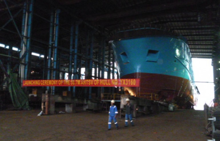 On November 11th 2012, the launching ceremony for Martens Marine’s 58.7 M AHTS Vessel YX3160 was held on dry dock #1 of Yuexin shipyard. YX3160 is built to ABS Class and includes the notations: A1 “OFFSHORE SUPPORT VESSEL, AH, TOWING VESSEL, FIRE FIGHTING VESSEL CLASS 1”, AMS, and DPS-1.